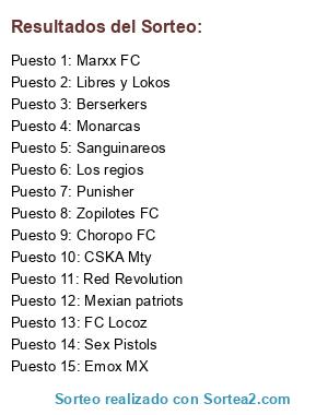 Lista de participantes: Choropo FC, FC Locoz, Emox MX, Punisher, Sanguinareos, Mexian patriots, Marxx FC, Monarcas, Zopilotes FC, Sex Pistols, Red Revolution, Los regios, CSKA Mty, Libres y Lokos, Berserkers.