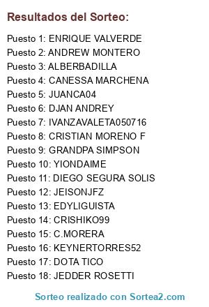 Lista de participantes: CRISHIKO99, CRISTIAN MORENO F, IVANZAVALETA050716, JUANCA04, ALBERBADILLA, JEDDER ROSETTI, JEISONJFZ, KEYNERTORRES52, C.MORERA, GRANDPA SIMPSON, DOTA TICO, CANESSA MARCHENA, ENRIQUE VALVERDE, DJAN ANDREY, YIONDAIME, EDYLIGUISTA, ANDREW MONTERO, DIEGO SEGURA SOLIS.