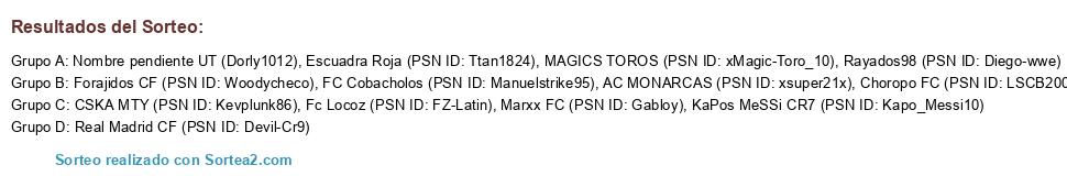 Lista de participantes: FC Cobacholos (PSN ID: Manuelstrike95), Fc Locoz (PSN ID: FZ-Latin), KaPos MeSSi CR7 (PSN ID: Kapo_Messi10), Nombre pendiente UT (Dorly1012), Escuadra Roja (PSN ID: Ttan1824), CSKA MTY (PSN ID: Kevplunk86), Choropo FC (PSN ID: LSCB2009), Real Madrid CF (PSN ID: Devil-Cr9), MAGICS TOROS (PSN ID: xMagic-Toro_10), Forajidos CF (PSN ID: Woodycheco), Marxx FC (PSN ID: Gabloy), AC MONARCAS (PSN ID: xsuper21x), Rayados98 (PSN ID: Diego-wwe).