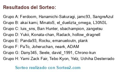 Lista de participantes: ADAM, akai kami, Ban Hunter, Chrono-kun, Dany345, david_1991, el_duelizta_omega, emanueloutn, Ferdoom, Hanamichi-Sakuragi, hollow_dragnell, jamc93, Joheruchan, Konata-chan, L30N3L, luis_sns, MinatoS, neark, Panda93, PaTo, plank, Radack, Rocku, SangreAzul, sbachampion, Seele, Tebo Kyon, Uchiha Desterrado, Yami Zack Fair, Yelz, Yukii, zangetsu.
