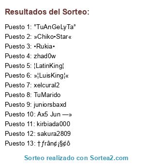Lista de participantes: ¦LatinKing¦, *Clóudly*, XxkataryxX, †ƒrân¢¡§¢ô, zl†DaZeeR†lz, NewHernan, Miku(Espacio)Nyan, (Espacio)Eros(Espacio), *Naoki*, AngelMarco, —׊exîMorenâ, • Amethyst ~, NyuChan21, •NaruDeSaku•, aleziita, fernandito4, sTon, IITheCrissII, Tsonga, »~Joss~«, TheDunald, —»ZönZhiTöh«—, XImarcIX, DarkAndyxD, xDsTeVenDx, kaiba_seto, kaicer15, Elvis1999, †SeRgIoO†, AreLyTHa, cadaver123, Jurio, amarucito, AntoNy, SaKu, •¦Pk—»Cin, •¦Toøxicø¦•, llKiMeRll, leidy971, johyas, PanGHy, --Lunita--, JoXeciito, GvRRiTv, •ßùnnÿLövé•, (*)(*)Pudín(*)(*), iTzDarkTochi, Joxexiito, ›¦ Žhêy ‹3, elmorfor, JohnTlv, Jhon~, Ma da Faq, Clen, danielraperi, ~†™Çh£ÇhØ™†~, ~Ðulcesi†ö~, xxedyxx, × Mûsî†ø ‹3, luzmyla, rodri75, ~×Luis~×, Buu(*)Buu, ~OriGinalxD~, sweet_18, CariñOsito, »Øne«—™, ivannitazz, ZzTYaNTzZ, j0sexD, paul_tkm, DarkDeamon, xLordNarutox, xtrokex, TzpOllitO, abraham12, fresitalove, k3vib, çYeRsOnÇ, †--PUNK--†, audilokox123, —»KNЕJorge, †¦—»xkã~£mõ«, JoRgE_PrO_AL, rockox, ~¦»KäïTö«¦~, McDiana, Pily88, 948968210, nixii, mimixt, × Oßzkûró«, junnn, × Oßzkûró «, james534, -Sommer---xD, xGuillermo97, mellegas, GckCrazy, —»Cårïñøzî†ø, AyJX, >K-Nejito<, Kpop2pm, pitulora13, ESCORPIO27, -LPS-§Jhona§, nicolas98816, DancerOMG, DarkGatito, ---sommer-xD, yinyersxx, frezzitha06, sharitotlv, ChicaPasiva, DeathKnightX, jjliseth, jhomy, «—DaRiO—«, tuxixo17, »Love•Mê~, × Peiin ~, Cc Jhack ‹3, »¦Ëmözïön¦«, elmagni, ×█Boøgi ice», •╣Chiaky╣, porch, kaeka_AvU, €mOziitoo, genarx, ¥ Coldness ¥, XxXChriSXxX, ikuto_96, brendax_10, Ang£lR£turn™, LeandreX, xXcaroxX12, «–càrlit0s–», Mei_chan, ficho, marlin2010, danzariner, luistlv100, Oo0Heros0oO, •¦Hey·Mee¦•, Hime_no_shi, CaSaDoR, xR4yz3nx, California20, dragon_10, ¦C——»ßeßöw™, LuisItO, » Jerry «, Desyre, r0lliiziit0, moises_punk, Xxalexito01, juniorsbaxd, XxslashxX, josesito145, xpinkixd, Ad-LeeN, ¨¨--snick--¨, nany21, xzmiguelxz, Gatitolindo, †~DiAbLitO~†, †LoKiTho†, x¦(*)Bummy(*)~, ×Chikâ~Côôl«, JuliOMazZNah, nani1906, (espacio)chicaSOAD, •SrGatito«, HhanZzoux, †xiikita†, eduardoooxd, •RedBull•, tkmmusit, fOxOne, •Ax5—»Clâû, †ChicoDark†, yuas, landers3, kirbiada000, princess86, yvoncita, KatinxD, Xeva01X, MeluAngeles, •Rukia•, elterrible02, ~prirss~, Neko-Nya, N4nDo, ×ßeßiTä—», EDSON, ›¦ D ¦‹, pamelhitaw, »†uNeNii†o«, alomo_159, xikitha_bnt, xVictorXD, ~†RoKeRiTo†~, »¦LuisKing¦«, DiVatlvtkm, ——»†øn†ii†a«, Oner, »Friô Rikô, XxvalkyxX, LeidiZiiTa, Stereo~Vanz, -->Darsta, xXJuaNdV-LXx, ×F—»Beâµty •, pierpz, AKATZUKI, » Mákótó «, Ro~Ró, ¨¨: rube, †0lD3m4R†, jeanfri, ZunakiitoO, netzon1234, modo20512, —»¦Boíí~Lag•, Heleen, Oo»NicK»oO, princeziita, »¦Ho†-†ôch¦«, •Diamante•, (*)›(*)Dhànn(*)‹3, Farro1231, zhad0w, SexVicios, gilmer1590, sakura2809, ~choco~nyu~, hugotlv, Minie_Love, › ChikoNice ›, Yárus, ——››Garuuh•, jpnl, Grind, albert00123, tentationxd, †sOnrïsÄz, °TuAnGeLyTa°, miki1809, —»EmOzO«—, ×G~Devil×, barbie1211, Kirara, lynette, Tê Adôrô Pêw, Fan†asmi†o ×, Fúckencio, Gö Mi Nam ~, × AloneNumb~, GerALsiTo, CrIsThIaNo0, Max300, N†L •Gärü™, -‡†juan†‡-, wifilandia, Poolfeifer, minfly, jeanxxc, elterrible01, blackero, cesar132, xelcural2, XTUxLOKITOxX, —xSr•Miau, elangeluz, A§è×ual ‹3, ângéllí†ó, neomarco, Nico(*)Robin(*)~, -Eluveitie-, Xxrodrigo95, —»KNЕDante, xXxPORTAxXx, » Y a z «3, sspand, •~Lucero~•, Cupido, MañoseaMé, †•Psico•†, --JoNaThAn--, Misaki(*)San, •¦RicharЦ•, HueViiToxD, Gabu(*)Nyan, CupCakexX, • Tú Mamá •, ¦C¦—»Hµg ‹3, CaNeLaZo™, anasofia_30, edox, «ß£ßítø», emoxitaTron, Soul Nyan, xxbr4tix, Han Jun Su, »—»Cøkê†ø~, JuAnDiEgOxD, »¦Ryuji¦«, kafkaa, x¦Riko x !, •HyN—«CriZz•, Lil' Shion, hihOpfOrever, julio_012, I Jefri, iTzChicoPunk, Ax5 Jun —», ×---CoZii†o×, llrenzoll01, adrimil, ¤¦ Moon ☇3, -Shorys-x, •—»Dakar«—•, › Dí CrônoZ, kaoru-chan, Miyuki_Kotoi, CrAzYCooL, pinky pinky, yeraldincitz, dekax2, joel153, »Chiko•Star«, »Dj-£ros«, »¦ƒaLLenGe¦«, †~PaUlSiTo~†, DylanTurner, XxerkzitoxX, zStyle, noedi, ()Bombon, ¦Love-prinz¦, •£mOzhii†o«—, †mery†, criss1717171, jessika1993, ----Alex----, unicaxx, »—J•ô•§•§—», BLESSE, saulhk, EMER, Magdyel48, xxzecuasxx, yosting, Juanzito29S, zlByanHz, ssbetoss, ItzCarlos, JhayroxD, the_kill™, Ramaelkpo, carolinaH, iSoul, ×BêšhâMê•N•, ChikoSéex, Sky Fokín, -_Naoki_-, ••†øn†i†ø••, •¦ £×†asis ~, ~Neko-Boy~, › Job Dey ×, › Job Juan ×, AndreitA, TuMarido, »¦Cris†iän¦«, loquiño.