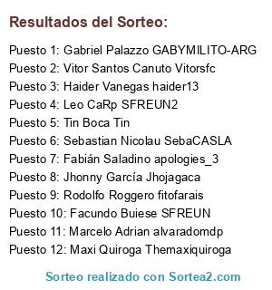 Lista de participantes: Facundo Buiese SFREUN, Rodolfo Roggero fitofarais, Marcelo Adrian alvaradomdp, Leo CaRp SFREUN2, Vitor Santos Canuto Vitorsfc, Gabriel Palazzo GABYMILITO-ARG, Maxi Quiroga Themaxiquiroga, Fabián Saladino apologies_3, Haider Vanegas haider13, Tin Boca Tin, Jhonny García Jhojagaca, Sebastian Nicolau SebaCASLA.
