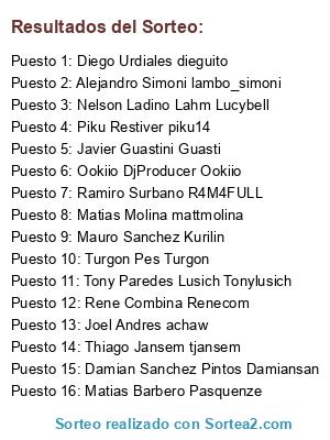 Lista de participantes: Turgon Pes Turgon, Nelson Ladino Lahm Lucybell, Matias Molina mattmolina, Tony Paredes Lusich Tonylusich, Joel Andres achaw, Damian Sanchez Pintos Damiansan, Mauro Sanchez Kurilin, Javier Guastini Guasti, Diego Urdiales dieguito, Piku Restiver piku14, Rene Combina Renecom, Ookiio DjProducer Ookiio, Ramiro Surbano R4M4FULL, Matias Barbero Pasquenze, Alejandro Simoni lambo_simoni, Thiago Jansem tjansem.