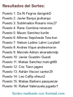 Lista de participantes: Rene Combina renecom, Javier Guastini Guasti, Mauro Sanchez kurilin, Rafael Valenzuela jugador1, Marcelo Adrian alvaradomdp, Sublimados Rosario mou27, Matias Barbero pasquenze, Criz Tiann jagerx, Matias Sanchez mati-gti89, Nelson Ladino Lahm Lucybell, Alfonso Sepúlveda Tora-kun, Adrián Viscovi cantor29, Javier Barqui javibarqui, Leo CaRp sfreun2, Da Ri Fegrva davigolxD, Andres Vique andresmoron.