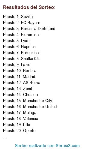 Lista de participantes: FC Bayern, Borussia Dortmund, Atletico de Madrid, Barcelona, Madrid, AC Milan, Inter, Juventus, Napoles, Arsenal, Chelsea, Liverpool, Manchester United, Manchester City, Spurs, PSG, Oporto, Zenit, Bayer Leverkusen, Shalke 04, Malaga, Sevilla, Valencia, AS Roma, Fiorentina, Lazio, Everton, Newcastle, Lille, Lyon, Marsella, Benfica.