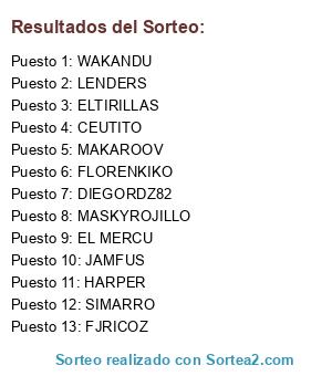 Lista de participantes: LENDERS, JAMFUS, SIMARRO, MASKYROJILLO, WAKANDU, ELTIRILLAS, CEUTITO, FLORENKIKO, FJRICOZ, DIEGORDZ82, MAKAROOV, HARPER, EL MERCU.