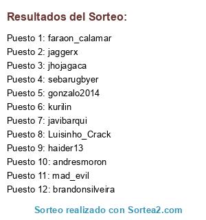 Lista de participantes: gonzalo2014, Luisinho_Crack, javibarqui, sebarugbyer, haider13, jaggerx, kurilin, brandonsilveira, jhojagaca, andresmoron, mad_evil, faraon_calamar.