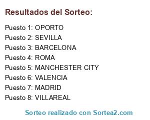 Lista de participantes: MANCHESTER CITY, BARCELONA, MADRID, ROMA, OPORTO, SEVILLA, VILLAREAL, VALENCIA.