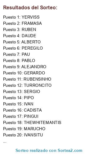 Lista de participantes: LEGO, JOSEMA, RUBENSINHO, PEREGILO, RIOS, SERGIO, ALVARITO, DANITORIX, CADISTA, IVANSITU, PINGUI, PAU, DAUDE, KAGAXIN, RUBEN, PABLO, YERVISS, NACHO, MARUCHO, PUMUKY, THEWHITEMANTIS, ALBERTO, PIPO, DAVTRE, IVAN, FRAMASA, GERARDO, TURRONCITO, SACRIS, ALEJANDRO.