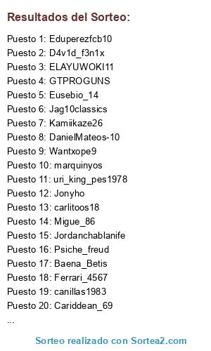 Lista de participantes: llosoigrut, Aaronfg298, carlitoos18, Soccatala73, Psiche_freud, i52capip, mirocal01, oscaaar92, Eusebio_14, Wantxope9, jandrito10, Sr_Osquitar, Cariddean_69, Jag10classics, Jonaportero6, Luysvoorhees, Eduperezfcb10, uri_king_pes1978, marquinyos, canillas1983, Jonyho, Baena_Betis, Migue_86, FRIAS_01, Er_wakandu, ELAYUWOKI11, DanielMateos-10, SOTO___11, claupera22, D4v1d_f3n1x, Manelo04, xavi_t-parte, Julius-kami, GTPROGUNS, pitifuiii, IMPARABLE_1898, MOITENERIFE, Ivanovic23, Ferrari_4567, Sergioheras_, Mr_Igorcete, Kamiikaze26, Jordanchablanife.