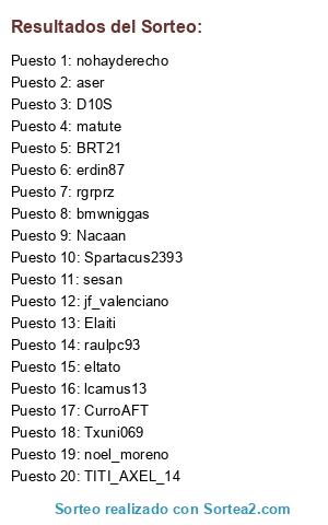 Lista de participantes: TITI_AXEL_14, erdin87, BRT21, jf_valenciano, CurroAFT, sesan, raulpc93, D10S, nohayderecho, matute, noel_moreno, bmwniggas, Nacaan, aser, Spartacus2393, rgrprz, Txuni069, lcamus13, Elaiti, eltato.