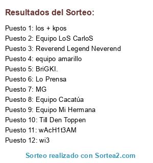 Lista de participantes: Till Den Toppen, Equipo Mi Hermana, Equipo Cacatúa, Equipo LoS CarloS, los + kpos, equipo amarillo, MG, Reverend Legend Neverend, BriGKI., wAcH1t3AM, wi3, Lo Prensa.