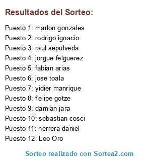 Lista de participantes: Leo Oro, jose toala, damian jara, rodrigo ignacio, herrera daniel, yidier manrique, jorgue felguerez, sebastian cosci, raul sepulveda, marlon gonzales, f'elipe gotze, fabian arias.
