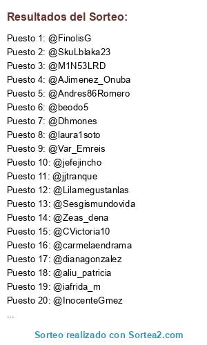 Lista de participantes: @escritortao, @KarennKiowa, @boagliopupi, @NMarmor, @PatriciaRichm_, @CsarGlvez1, @_naschez, @leo_veritas, @MaryMuffin__, @Ikormar, @mcolina09, @Anavillalobos17, @M1N53LRD, @AlfredoAly, @ClaudiaSerra16, @Malinessa2, @PegarzEscribe, @carmelaendrama, @CyranoHuelva, @EightaRibbon, @Zeas_dena, @eduardoylalata, @Pienpy, @biciclistaDsofa, @iafrida_m, @marmota2109, @Joshuacagose, @Imaginarecrea, @Erekos00, @CVictoria10, @AMC2081, @mayelacarrillo, @magulas, @MartaOlls, @miriamcastrom, @cntaengua, @AlmuAlonso13, @vjlorente, @SkuLblaka23, @marta_cueto, @ALIRIOFernand16, @SrPolite, @RaquelCartima, @patriciagoncast, @El_Zuliano, @carmen19691975, @873aacce7ac4439, @yalisneth, @PlanetaNurbis, @kikegarsan, @YolanAF, @MicroblogC, @AJimenez_Onuba, @CarolinaBergel, @beodo5, @dachanazoa, @Lilamegustanlas, @rafa_linero, @RaquelB93, @lizbecita_diaz, @adelapoite, @jilguero65, @gvad2556, @Ricardo_Jaras, @HenarHerranzEgi, @deudedith18, @SilvEuge, @TigreSand, @MissSais, @isabelbarrio1, @loselvira, @laura1soto, @little__lucia, @InocenteGmez, @MariaenEUropa, @MoleraLola, @Aly_Yaneth, @Ciin_30, @misletrasnuria1, @vicenamon, @Chioarreola1, @editorialayrmed, @sinelo1968, @jaraluan, @bonobomono, @LorenaMoreu, @Var_Emreis, @KanaleLilie, @CelesteSerranoV, @galainos, @IsabelMataVicen, @beaveil, @Rizoswoman, @Angeleslop, @bia_doc, @AlboLoreto, @tonisolano, @NestorGarridoHz, @jacquescalona, @Protoplasto, @Natvil83, @ying_yang_08, @criptografo, @vem_56, @YlanzLanz, @gabitamamora, @dentromonolito, @saulkali, @supersalto1, @alealamo, @javiergvega, @dremersonrodas, @madrestresadas, @AJ_Lucky_, @fgascob, @ArabellaMaza, @SergioVanoG, @jose4jimenez, @lluismora, @YaMarMartinez, @toutandcomeon, @angelmatospoeta, @acuervomont, @AgonicoVzla, @JairoPinto30, @chemapizca, @arlene8022, @Lazulago, @lacajonera, @castelloce, @rosataberner, @josemelchor1, @juantoman, @Castellonear, @rebecca_caruci, @rondomar, @clauzca, @sbonacho, @ANAPERNIAM, @rufialex, @Dhmones, @dianagonzalez, @londones, @Joseisdin, @jefejincho, @enrique_sese, @jjtranque, @QSTOYQUEMAO, @Dulcerengel, @PerezOsa71, @Sabina_ML, @Estefi_SV, @melanycastaneda, @ariesaurora, @mrubio67, @MamenFernndez5, @cuentofurtivo, @huesodelacereza, @elarbolcaido_, @GruMiquel, @Kjpa__, @SerraVaz, @FManzaal, @AmparoGalindoC1, @thekischa, @marguita_41, @Liliana88449586, @BooksSanjiro, @Eduardo80460387, @dermisRodriguez, @FinolisG, @ramonCastroPer2, @Emilio69163342, @misslibros_, @NorisRe67703261, @ana_ferrus, @MrSchultz3, @MiguelAnDoc, @kadavains, @Pistonetti1, @Andres86Romero, @nellytaylor1414, @Gaby_DelaO_o, @Educitico, @pazanacris, @Al70398391, @MFilosofal, @Borgiam5, @chaoxanxiao, @LaYoliVk, @lfdelsignore, @Paloma_BaySor, @Marisazayas1, @ipoolgian, @yasmincnunez, @Mikel27010864, @tweet_me_more, @ConstabileR, @_Juan_Karlos_, @merhoyos, @SandraPenagos13, @humanjose_, @SilvanaLameiro, @Sesgismundovida, @CocheMandarino, @silgoncha, @Begobardales, @PiedadGranados, @juanrverona, @sofizacagirl, @jjmunozrengel, @Marawpi, @aliu_patricia, @Bule_coach, @_juanalfonso_, @Saelpa3, @alvarengas19, @Gildestruz, @xavier8estevez, @raulalonsofer, @Laura_FdezRoche, @eznous, @UnaMujerDe48, @azulglaciar, @porta_roser, @ISDIN, @Rola68_, @Estudio2Galiana, @frokien, @nadiafank, @marijose_fdez, @OrtizGaleano, @milabarrio, @papela27, @DiegoLemi11, @beatrizbecerrab, @raul_rafer, @pacosegorbe, @thaimiv, @Alfonso_Robles7, @llaneando1, @truquitosdeuna1, @la_profespanol, @Rpm86898631, @ALMAYPAPEL, @Siena28640658, @BalbuRafa, @GianBustti15, @Charls_writter, @anamvida.