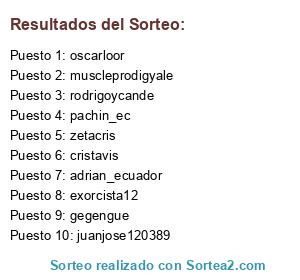 Lista de participantes: pachin_ec, muscleprodigyale, adrian_ecuador, juanjose120389, zetacris, cristavis, oscarloor, exorcista12, rodrigoycande, gegengue.