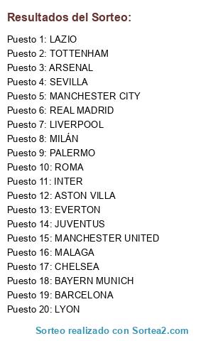 Lista de participantes: MILÁN, MANCHESTER CITY, CHELSEA, INTER, BARCELONA, REAL MADRID, MANCHESTER UNITED, JUVENTUS, TOTTENHAM, BAYERN MUNICH, LIVERPOOL, PALERMO, ARSENAL, ASTON VILLA, ROMA, LYON, EVERTON, MALAGA, LAZIO, SEVILLA.