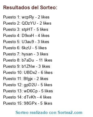 Lista de participantes: RUxxN - 11 likes, b7aDu - 11 likes, kpeNZ - 8 likes , D91RX - 7 likes , UBDx2 - 6 likes, UnM8b - 6 likes, stpHT - 5 likes, 6kzU - 5 likes, wD6Cp - 5 likes, 98GPx - 5 likes , gpD2U - 5 likes , VxK4R - 4 likes, YHb7s - 4 likes , AuFvY - 4 likes , dTvKh - 4 likes , D9xxH - 4 likes , sEcAc - 3 likes , U3au9 - 3 likes , z9rdm - 3 likes , hysan - 3 likes , b1ZNw - 3 likes , QDzYU - 2 likes , Bfgjx - 2 likes , wcpRy - 2 likes.