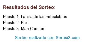 Lista de participantes: Roxana, Ángela León, Bibi, Eyra, Mari Carmen, Mª Ángeles, Natalia, Carmen (chef964), Yakoytroy, La isla de las mil palabras, Lunilla, Fernando Barceló, Marina Córdoba, Fulnavalon, Marga Ramón, Irunesa, Domiar.