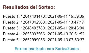 - 2021-05-27 09:03:20 (GMT): Se ejecuta el sorteo