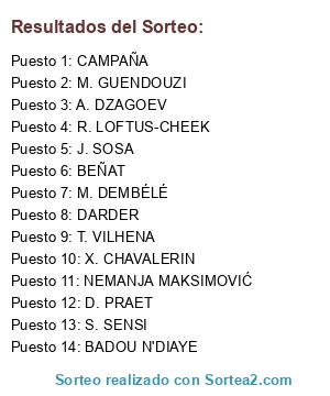 Lista de participantes: R. MARIN, N. AMIRI, D. PRAET, B. CRISTANTE, S. SENSI, ROQUE MESA, A. LALLANA, DARDER, M. GUENDOUZI, J. SOSA, M. DEMBÉLÉ, F. FAJR, M. DE ROON, T. VILHENA, R. LOFTUS-CHEEK, RENATO SANCHES, P. PÉREZ, NEMANJA MAKSIMOVIĆ, X. CHAVALERIN, GERSON, CAMPAÑA, BEÑAT, BADOU N'DIAYE, A. DZAGOEV.
