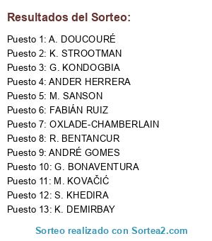 Lista de participantes: K. STROOTMAN, ANDRÉ GOMES, K. DEMIRBAY, G. BONAVENTURA, S. KHEDIRA, M. KOVAČIĆ, ANDER HERRERA, G. KONDOGBIA, OXLADE-CHAMBERLAIN, FABIÁN RUIZ, R. BENTANCUR, M. SANSON, A. DOUCOURÉ.