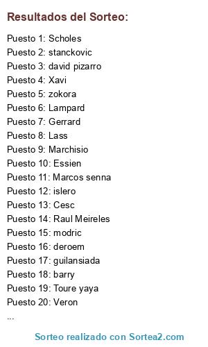 Lista de participantes: Cesc, Lampard, Essien, Gerrard, Toure yaya, Felipe Melo, Pirlo, Seedorf, De rossi, Xavi, Iniesta, Marcos senna, Veron, Raul Meireles, Scholes, Deco, Montolivo, Marchisio, Van bommel, Schweinsteiguer, Mascherano, Frings, Sergio Busquets, Sneijder, Lass, modric, stanckovic, guilansiada, toulalan, cambiasso, david pizarro, xabi alonso, zokora, barry, deroem, islero.