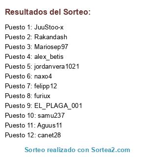 Lista de participantes: EL_PLAGA_001, canet28, Mariosep97, naxo4, furiux, JuuStoo-x, Rakandash, samu237, jordanvera1021, Aguus11, alex_betis, felipp12.