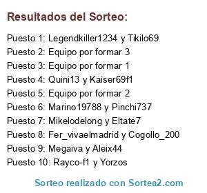 Lista de participantes: Megaiva y Aleix44, Mikelodelong y Eltate7, Rayco-f1 y Yorzos, Fer_vivaelmadrid y Cogollo_200, Marino19788 y Pinchi737, Quini13 y Kaiser69f1, Legendkiller1234 y Tikilo69, Equipo por formar 1, Equipo por formar 2, Equipo por formar 3.