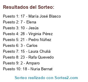 Lista de participantes: 1 - Anabel, 2 - Amparo, 3 - Carlos, 4 - Conchi, 5 - David, 6 - Eve, 7 - Elena, 8 - Isabel, 9 - Javier Domingo, 10 - Jesús, 11 - Julia, 12 - José Manuel, 13 - José Medina, 14 - Javier Sáez, 15 - Laura Chuliá, 16 - Laura Martínez, 17 - María José Blasco, 18 - Nuria Bernat, 19 - Nicolás Moreno, 20 - Paco Barea, 21 - Pedro Núñez, 22 - Raquel Carrero, 23 - Rafa Quevedo, 24 - Rosa Serra, 25 - Silvia Pérez, 26 - Tamerlan Kachkarov, 27 - Víctor Maseres, 28 - Virginia Pérez.