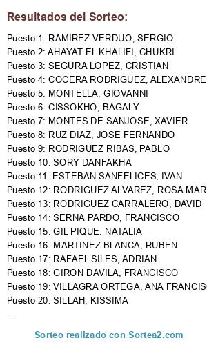Lista de participantes: AHAYAT EL KHALIFI, CHUKRI, ALBEROLA PALAU, JESUS, ANGUITA ABRIL, PEDRO JUAN, BANEGAS ORTEGA, NURIA, BARBA PEREZ, RAUL, BARNILS MONTSANT, JORDI, BARTOLOME BARBERÀ, VICTOR, BENAISSA BENZIAN, SAID, BERBEL PASCUAL, ANTONIO, CAMARA, SALLY, CAMPOS LORENTE, EMILIANO, CASTELLANO CRESPO, SANDRA, CASTRO VALENCIA, CAROLINA CRISTINA, CEBALLOS LLORCA, JESUS, CIRERA FRANCAS, JORDI, CIRERA FRANCAS, JOSEP, CISSOKHO, BAGALY, COCERA RODRIGUEZ, ALEXANDRE, COULIBALY SIDI, COULIBALY, SEDIFO, CUBERO ACOSTA, JOSE, DANFAKHA A. KIBILY, DIABY, MAHAMADOU, DICKO, SAMBA, DIAZ CAMPOY, ANGEL, DORADO FERNANDEZ, DANIEL, EROLA PORTA, ANNA, ESTEBAN SANFELICES, IVAN, FONTOVA REGUANT, RICARD, GALVEZ MALAGON, PEDRO, GIL PIQUE. NATALIA, GIRON DAVILA, FRANCISCO, GONZALEZ FERNANDEZ, VÍCTOR, GORDILLO SANTIAGO , OSCAR, GORDO PINO, MANUEL, GUELDOS FRANCÀS, MONTSERRAT, GUIRAO SANCHEZ, ALBERTO, HERNANDEZ LOPEZ, ELISABET, JENIYAH, MUSTAPHA, MADERA JIMENEZ, ANTONIO, MARMOL RODRIGUEZ, JUAN, MARTIN GONZALEZ, MARIA ISABEL, MARTINEZ BLANCA, RUBEN, MARTINEZ MONFORT, JOSE LUIS, MEDINA CUADRADO, DAVID, MONTES DE SANJOSE, XAVIER, MONTELLA, GIOVANNI, MUNUERA GALERA, ORIOL, OJEDA REYES, RODBERTO DE JESUS, PAJUELO CRUZ, JOSE ANTONIO, PAVON ALVAREZ. MARTA, PEREZ SIMON, GEMMA, PORCEL FERNANDEZ, MARIA LUISA, RAFAEL SILES, ADRIAN, RAMIREZ VERDUO, SERGIO, RODERO MARQUES, JOSE ANTONIO, RODRIGUEZ ALVAREZ, ROSA MARIA, RODRIGUEZ CARRALERO, DAVID, RODRIGUEZ RIBAS, PABLO, ROMERO VARAS, RAÚL, RUZ DIAZ, JOSE FERNANDO, SADA VILLA, XAVIER, SANCHEZ LEON, ROSA, SEGURA LOPEZ, CRISTIAN, SERNA PARDO, FRANCISCO, SOLER PEREZ, LAURA, SYLLA, KEMOKHO, SYLLA, MAMADOU, SILLAH, KISSIMA, TERRONES ABELLAN, ISAAC, TOLEDO SANMIGUEL, JOEL, TOUNKARA, ABDOULAYE, TRESERRA BUSQUETS, CARLES, TURCU, CONSTANTIN CIPRIAN, VARGAS PEREZ, LAURA, VELAZQUEZ ALCAYNA, LOURDES, VENTALLO MESTRES, OLGA, VILAPLANA COSTA, JOSEP, VILLAGRA ORTEGA, ANA FRANCISCA, ZAMORA JIMENEZ, JOSE MANUEL, BANNA GASSAMA, SORY DANFAKHA, JOSE PEDRO RODRIGUEZ, CONCHI TRINADO RUIZ, FRANCISCO PLAZA, ALBERT ENRICH, EVA FRANCAS, SAMUEL RIOS, DIEGO RODRIGUEZ, ELOY FERNANDEZ.