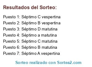 Lista de participantes: Séptimo a matutina, Séptimo B matutina, Séptimo C matutina, Séptimo D matutina, Séptimo A vespertina, Séptimo B vespertina, Séptimo C vespertina.