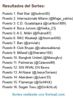 Lista de participantes: RKC Waalwijk (@Norman000), Bari (@srrivlah), Red Star (@bukron00), Flamengo (@GoNHiX), Al-Nassr (@JesusTorress), Club Brujas (@cabezaablana), Bangkok United (@Manugfcv), Boca Juniors (@Nelka_23), Aberdeen (@Juanr33), Sagan Tosu (@EmilichLol), Millwall (@Sheraton159), C.D. Guadalajara (@carlitos1899), Internazionale Milano (@Mago_yalma), A.C. Milán (@Rubos87), Palmeiras (@Catarsis89), SIN RIVAL EN 8avos.