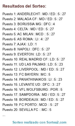 Lista de participantes: BOR. DORTMUND LD 5, LIVERPOOL MD / ED 5 27, AS MONACO DFC 5, FC BAYERN MC 5, ARSENAL MD / ED 5 27, AJAX LD 1, REAL MADRID CF LD 5 27, FC PORTO MCD 5 27, CELTA MD / ED 5 27, MALAGA CF MD / ED 5 27, UD LAS PALMAS LD 5 23, VFL WOLFSBURG POR 5, BORDEAUX MD / ED 5 27, EVERTON LD 5 27, BORUSSIA MG DFC 4, LEVANTE UD DFC 3 27, SPURS MD / ED 5 27, OLYMPIAKOS MCD 5 27, AC MILAN MCD 5 27, NAPOLI DFC 5 27, WERDER BREMEN LI 5 27, PANATHINAIKOS LI 5 23, SAMPDORIA MD / ED 5 27, INTER MC 1, ANDERLECHT MD / ED 5 27, AS ROMA LI 4 27, SEVILLA FC MC 5.