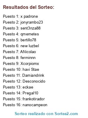 Lista de participantes: ANicolao, bertillo78, Damiandrink, eckae, ferminnn, frankotirador, havi Stae, jonyrambo23, nanocampeon, new luzbel, Pregal10, qmemetes, sent3nza88, x padrone, Xcorpiomx, Desconocido.