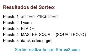 Lista de participantes: MILmaster-DAK [White], LINKINPARK GM, Abimael SVyM, CHhaZZzZ, Gunsteel-DAK, Kronnus [C-gm], Chivox-DAK [White], "†AyD†"Sasuke-Kun, A&D Anakin, Gohan1708, Ilusionista, Shikamaru-DAK[White], 4ta Espada Ulquiorra, DANIELGUIZA9 [LSK], YC_†Jα∂єηη Yuĸι†...The Prophet, "†"A&D"†" Rey Mysterio, MAKOTO.DS [NX], GM_PEGASSUS, KaNoN(TP), BLADE, Batalliom((C.B.I)), Samael NX, AdiCto[SVyM], ferCK000HaTaKe(WLD), darck-orfeo[c-gm]-i, sombrero de paja, Madara uchiha, CyriuS-SVyM, Light Brody[CSL], [ƒcj][[Gods Army]] ®øLø The Returns, Makijero, [[Gods Army]] †Heracles†, kel-el(Senju){Tsuchikage}, [[Gods Army]] † XElektro †, zafrada A&D, Guissepp [MOD], Jaiden Yuki, zerrO, Sanji, Darkcore-SVyM-, Chaos [C-gm], FENIX[BM], "†"A&D"†" Helios, Sylar, Polux LSK, MASTER SQUALL (SQUALLBOZO), DarkEvlOrl, Lyceus, John Smit, Max2260 [* T.Д.Қ.Д* َﱢﱟﱞﱡ۩ﱡﱞﱟﱢَHalcon], Hippie [RYP], Ryuken Masters, electro_tonyWLD, Mihawk, -Pr0- Betikadd, JUNK [LSK], ICHIGO, Miguel(C.B.I), †† P∆IN †† GM, A&D Minos, «︻┳═一 kî®ßî︻┳═一, Extreme rey yu gi oh, Delacroix AyD.