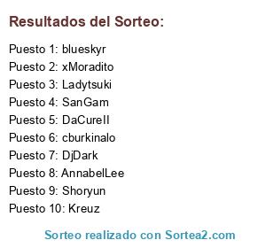 Lista de participantes: SanGam, xDracom, eiriyuki, cburkinalo, HaganenoW, AnnabelLee, enrique014, Mikiix, Shoryun, xBlacksoulx, saito17, kiba, DaCureII, Ladytsuki, ryouto, xMoradito, Geriitha2, ArsiiStyle, OsiTaEmo, xMrcnek, Jun10rDX, DjDark, FunPeople, xXArthasXx, Megami, Kreuz, Yukiko, Chopita, blueskyr, SweetGirl, Maguex, Evilgael, Cihodlis.