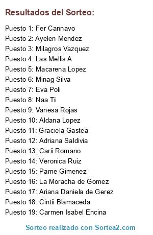 Lista de participantes: Aldana Lopez, Cintii Blamaceda, Adriana Saldivia, Veronica Ruiz, Minag Silva, Ayelen Mendez, Naa Tii, Carmen Isabel Encina, Las Mellis A, Ariana Daniela de Gerez, Fer Cannavo, Pame Gimenez, Graciela Gastea, La Moracha de Gomez, Carii Romano, Milagros Vazquez, Vanesa Rojas, Eva Poli, Macarena Lopez.