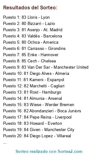 Lista de participantes: Iker Casillas 90 Real Madrid, Neuer 88 Bayern Munich, Buffon 85 Juventus, Julio César 85 INTER, Cech 85 CHELSEA, Stekelenburg 85 ROMA, Lloris 85 LYON, Akinev 84 CSKA, Adler 84 B.LEVERKUSEN, Diego Lopez 84 VILLAREAL, Victor Valdés 85 BARCELONA, Mandanda 84 O.MARSEILLE, Pepe Reina 84 LIVERPOOL, De Sanctis 83 NÁPOLES, Hart 83 MANCHESTER CITY, Abbiati 83 MILÁN, Wiese 83 WERDER BREMEN, Helton 82 OPORTO, Weidenfeller 82 BORUSSIA, Kameni 82 ESPANYOL, Given 82 ASTON VILA, Diego Alves 81 VALENCIA, Iraizoz 81 ATHLETIC BILBAO, Howard 81 EVERTON, Schwarzer 81 FULHAM, Fabio 81 CRUZEIRO, Friedel 81 TOTTEHNAM, Landreau 80 LILLE, Ruffier 80 SAINT-ETIENNE, Carrasso 80 GIRONDINS, Gomes 80 TOTTEHNAM, Frey 80 GENOA, De Gea 80 MANCHESTER UNITED, Patricio 80 SPORTING PORTUGAL, Viviano 80 INTER, Handanovic 79 UDINESE, Mihaylov 79 TWENTE, Ryzhkov 79 RUBIN KAZAN, Malafeev 79 ZENIT, Storari 79 JUVENTUS, Marchetti 79 LAZIO, Sirigu 79 PSG, Douchez 79 PSG, Jefferson 79 BOTAFOGO, Szczensy 79 ARSENAL, Robinson 79 BLACKBURN, Robert Zieler 78 HANNOVER 96, Moraes 78 BENFICA, Dikan 78 SPARTAK MOSCÚ, Foster 78 ALBION, Gordon 78 SUNDERLAND, Amelia 78 MILÁN, Jaaskelainen 78 BOLTON, Victor 78 GREMIO, Felipe 78 FLAMENGO, Ceni 78 SAO PAULO, Benaglio 78 WOLFSBURGO, Boruc 78 FIORENTINA, Isaksson 78 PSV, Vorm 78 SWANSEA CITY, Green 78 WEST HAM, Romero 77 SAMPDORIA, Rensing 77 KOLN, Andújar 77 CATANIA, Aouate 77 MALLORCA, Guilherme 77 LOKOMOTIV, Claudio Bravo 77 REAL SOCIEDAD, Gillet 77 BOLOGNA, Sorrentino 77 CHIEVO VERONA, Prass 77 VASCO DE GAMA, Ospina 77 OGC NICE, Enyeama 77 LILLE, Fabianksi 77 ARSENAL, Gabulov 77 CSKA, Aranzubia 77 DEPORTIVO, César 77 VILLAREAL, Butt 77 BAYERN MUNICH, Drobny 77 HAMRUGO, Baumann 77 FRIBURGO, Bracalli 77 OPORTO.
