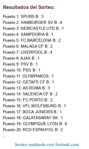 Lista de participantes: FIORENTINA B 2, SEVILLA FC B 1, VALENCIA CF B 2, NEWCASTLE UTD B 1, OLYMPIQUE LYON B 6, SPURS B 3, AS ROMA B 3, OLYMPIAKOS 1, MALAGA CF B 2, GETAFE CF B 1, FC BARCELONA B 2, AJAX B 1, SAMPDORIA B 1, PSG B 1, LIVERPOOL B 4, FC PORTO B 2, ATLETICO MADRID B 1, BOCA JUNIORS B 1, HAMBURGER SV B 4, GALATASARAY SK 1, RCD ESPANYOL B 2, PSV B 1, VFL WOLFSBURG B 1.