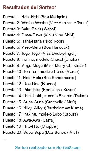 Lista de participantes: Awa-Awa (Califa), Baku-Baku (Wapol), Bane-Bane(Bellamy), Bara-Bara (Buggy), Beri-Beri (Capitán Very Good), Bomu-Bomu (Mr.5), Choki-Choki (Inazuma), Doa-Doa (Blueno), Doku-Doku (Magellan), Doru-Doru (Galdino / Mr.3), Fuwa-Fuwa (Kinjishi no Shiki), Gomu-Gomu (Monkey D. Luffy / Mugiwara), Gura-Gura (Edwar Newgate / Barbablanca), Hana-Hana (Nico Robin), Horo-Horo (Perona), Horu-Horu (Emporio Ivankov), Kage-Kage (Gekko Moriah), Kilo-Kilo (Miss Valentine), Mane-Mane (Bon Clay / Mr.2), Mato-Mato (Vander Decken), Mero-Mero (Boa Hancock), Nikyu-Nikyu(Bartholomew Kuma), Noro-Noro (Foxy), Ori-Ori (Capitana Hina), Ope-Ope (Trafalgar Law), Sabi-Sabi (Capitán Shuu), Shari-Shari (Capitán Sharinguru), Suke-Suke (Absalom), Supa-Supa (Daz Bones / Mr.1), Toge-Toge (Miss Doublefinger), Woshu-Woshu (Vice Almirante Tsuru), Yomi-Yomi (Brook), Sara-Sara , modelo Axolote (Smiley), Hebi-Hebi (Boa Sandersonia), Hebi-Hebi (Boa Marigold), Hito-Hito (Chopper), Hito Hito, modelo Gran Buddha (Sengoku), Inu-Inu, modelo Chacal (Chaka), Inu-Inu, modelo Lobo (Jabura), Inu-Inu, modelo Perro Salchicha (Lasso), Inu-Inu, modelo Dálmata (Vice Almirante Dalmátian), Mogu-Mogu (Miss Merry Christmas), Neko-Neko, modelo Leopardo (Lucci), Tori Tori, modelo Fénix (Marco), Tori-Tori, modelo Halcón (Pell), Uma-Uma, modelo Caballo (Pierre), Ushi-Ushi , modelo Bisonte (Dalton), Ushi-Ushi, modelo Jirafa (Kaku), Zou-Zou (Funkfried), Goro-Goro (God Enel), Hie-Hie (Kuzan / Aokiji), Pika-Pika (Borsalino / Kizaru), Magu-Magu (Sakazuki / Akainu), Mera-Mera(Gol D. Ace), Moku-Moku (Smoker), Numa-Numa (Caribou), Suna-Suna (Crocodile / Mr.0), Yami-Yami (Marshall D. Teach / Barbanegra), Gasu-Gasu (Caesar Clown).