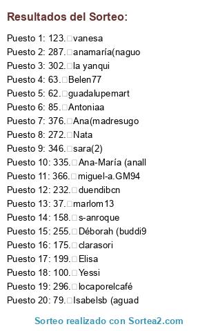 Lista de participantes: 1. Gara , 2. Valeria, 3. Morgan, 4. Adaldrida, 5. Victoria, 6. VirginiaS, 7. Romi, 8. Ana1, 9. Mercedes, 10. LourdesD., 11. Campanilla, 12. Pinkiland, 13. Damadelasperip, 14. María1, 15. Raque, 16. Esmeralda1, 17. Raquelita, 18. AnaMakeUp, 19. Quincalla Otorga, 20. SoniaHerrero, 21. Leti24, 22. soñadoraM., 23. SVaRaDa, 24. Mika, 25. Irenechillon, 26. Yolanda1, 27. Yolandayolbroo, 28. BeatrizdelaIgles, 29. Lulú, 30. Pipi, 31. Quina A.R., 32. Tabitha, 33. Mr.Colmic, 34. Beatriz2, 35. PazChao , 36. JessicaMartín , 37. marlom13, 38. palotes, 39. Rubén(epitelial, 40. Goretti, 41. Pilar7319, 42. María (2), 43. Irene lede, 44. Raul (almacen23, 45. Diego1, 46. Rosario(mariate), 47. Mari (maritristán, 48. Chantal, 49. MaríaJosé1, 50. BeatrizMENA, 51. Carmen(amiga, 52. Masiera, 53. EvaVilla, 54. Irene3, 55. Javieramil, 56. Jose Vicente, 57. Edel, 58. Evita(eva24alma, 59. edelagf, 60. Mercedesmp55, 61. teresitaBP, 62. guadalupemart, 63. Belen77, 64. JuanLuisHP, 65. Juanjo82, 66. Pilar1, 67. Josefina(manche, 68. RubenTM (rtrujill, 69. Verónica(marin), 70. Cristiantrujillo, 71. odaklesam, 72. irisa66, 73. Angeles1, 74. maría.yazminn, 75. joselito(joseant, 76. mariadetru, 77. Isabeliya (isabel, 78. Antonio Aragón, 79. Isabelsb (aguad, 80. bolboreta2009, 81. sogomar, 82. blanca, 83. obandina, 84. Monica1, 85. Antoniaa, 86. Yulia, 87. Maria (8/12, 88. AnaMaria(flamen, 89. Raquel (8/12-, 90. Albinajo, 91. Idaira hdz, 92. Gloria, 93. Lola1, 94. Vero74, 95. aguedaubeira, 96. Alicia (9/12-, 97. Mary Cielo, 98. AnnaP, 99. Cristina (bullido1, 100. Yessi, 101. Meredith, 102. maria24valencia, 103. YLM-SPAIN, 104. Naiara, 105. Pe, 106. CarmenR, 107. María(chacalverd, 108. auxiinblue, 109. jokin1969, 110. Josefa, 111. Vane, 112. marielagos2000, 113. Juan (9/12-, 114. Tormenta, 115. elena1977, 116. Rosa, 117. laia, 118. mayca62, 119. anichiro, 120. cegador, 121. Marta1, 122. antar, 123. vanesa, 124. verónica(vero69, 125. jose luis, 126. Isabel (nopuedo, 127. maricarmenlarr, 128. amaia, 129. anavaillo, 130. lorena carrillo, 131. marta.olvidico, 132. Paz (pazher5), 133. carmenlardies, 134. zaida, 135. esterina, 136. maríajosé manz, 137. Naty1, 138. nene, 139. Agave, 140. Blackie, 141. Elenahg, 142. Roberto, 143. PaquiMolina (pml, 144. Diosa Kali, 145. Paula(paularuizd, 146. Piruleta y ole, 147. Goliat81, 148. Miriamatienzar, 149. juani.nc, 150. Duende1973, 151. Piscis61, 152. Vero77, 153. Reinacotilla, 154. Dantitan, 155. triztriz, 156. MaríaJesús(maru, 157. SabineJ., 158. s-anroque, 159. mariajose-daure, 160. Juan(jcabezas), 161. Nisper, 162. Marita46, 163. Isa-09, 164. Angélicasancho, 165. diegobasas, 166. PilarGarcía, 167. abi.gp, 168. Deivi, 169. Laura GG, 170. Lluria, 171. Lola2, 172. m.mar P.N , 173. EnriqueRuiz, 174. Carolina, 175. clarasori, 176. Hager, 177. Pandora, 178. Candelita, 179. elgjca, 180. Blancanieves, 181. Elsa, 182. MireiaSanchez, 183. Alicia(mosabaka, 184. Olivia, 185. Sandra.sardina, 186. zapatitoos, 187. CapHachis, 188. Diana P.D., 189. Patry, 190. elclerigo, 191. Mar (lalocademil, 192. Esther1, 193. Rosa(tierra-aval, 194. Rendal, 195. Carmensanda, 196. ducadodejarand, 197. Maika, 198. Paola2, 199. Elisa, 200. María(mariquilla., 201. sa-ninia, 202. Marisa Alejandre, 203. Amaia (maipevivi, 204. EstherG.M., 205. Viaderoa, 206. Anuska, 207. mapez19, 208. macasastre, 209. envenenadapor, 210. unaveinteañer1, 211. lauranapoleón, 212. Alberto1, 213. Iria, 214. Noelia(quesolecil, 215. Esa soy yo, 216. Florinda, 217. Claudia, 218. Carla, 219. Julia(daimonass), 220. Unafan, 221. Unamanoloadic, 222. Ana(noteriasnot, 223. Loquita, 224. Kirian, 225. Soñadora, 226. Estephan, 227. Silvia (yaestalap, 228. welelei, 229. Bloody Rose, 230. elena v.c., 231. xesus, 232. duendibcn, 233. swelly, 234. lara, 235. angeles (maima, 236. angeles (yllel19), 237. Rocio, 238. Laura23, 239. Maite RB, 240. Diorohyeah, 241. Monica (elegant, 242. Alberto (precios, 243. Sandy, 244. Gabriela, 245. Rouge Addict, 246. María (3), 247. Ana.alvarez, 248. diana-ally, 249. María(melania20, 250. MartaSanchez, 251. Gema , 252. Maimonterola, 253. Ana(anapere40), 254. Almartingomzal, 255. Déborah (buddi9, 256. Aranzazu, 257. Barbara-martinal, 258. Patricia, 259. Laura, 260. Esmeralda(2), 261. Happy, 262. Mariola, 263. Cristina2, 264. sbenavente, 265. veronicamuygu, 266. menchiolmo, 267. nosoytuestilo, 268. manoletina28, 269. Sandy, 270. Claudia-Sury , 271. Charo, 272. Nata, 273. almartingonzal, 274. olga, 275. sissi, 276. mafalda, 277. Leticia, 278. marialuisa (mula, 279. Yurena, 280. Carol, 281. Purita, 282. Yolandaa, 283. Eva (garodev), 284. JimenaM., 285. La chica decham, 286. esther.alegre, 287. anamaría(naguo, 288. pilarita, 289. thais, 290. rosa (salameda, 291. SaraM., 292. fisiwoman, 293. Vazan, 294. Adelaida Perea, 295. Werty, 296. locaporelcafé, 297. elizabeth gomez, 298. anacaballero6, 299. Mari(2), 300. Maria, 301. Mari(3), 302. la yanqui, 303. sara, 304. Javier, 305. paky, 306. Ire, 307. tomatesverdesf, 308. aurorix, 309. samantha, 310. cbudo9, 311. starotenmeyer, 312. Luna, 313. Ana L., 314. Alejandra G., 315. Saray, 316. XVA, 317. JavierRobles (gr, 318. Monica (mfferrer, 319. Gema, 320. Ety19, 321. Angelica, 322. Antonio, 323. unalocaporelcol, 324. marta4, 325. lourdes (tumbab, 326. Olga(olgagf), 327. Diego(papamum, 328. Victor(victorfrier, 329. Manu(bravillin), 330. Carmen(karmara, 331. Ana2, 332. Vanessamilan, 333. Jennifer DrC, 334. Emmaby, 335. Ana-María (anall, 336. m.hitchcock, 337. Luisa A. Fuente, 338. Luisa Camara, 339. Heidi, 340. Malamujer, 341. Lary, 342. Lidia, 343. melania o., 344. Gug, 345. Marcias, 346. sara(2), 347. misteriosa Agath, 348. Lavinia, 349. fina (fijorcas), 350. Franciscosc15, 351. rakel(alkarce), 352. AK-71, 353. josefina (Joseph, 354. miquelolmoagu, 355. unapulgamás 356. unajuerguista , 357. yoqueriaserco, 358. tita hellen, 359. maria.jesus1985, 360. Français EOI, 361. Cemis Katerina, 362. Chispita, 363. Olgamartinfern, 364. empeñadaeng, 3