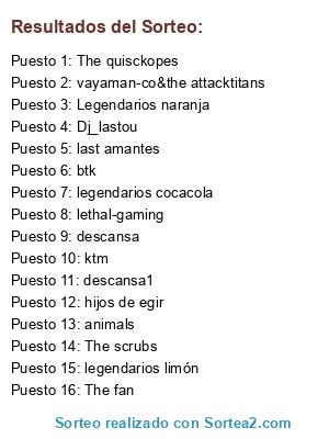 Lista de participantes: Legendarios naranja, legendarios limón, legendarios cocacola, lethal-gaming, ktm, animals, hijos de egir, btk, The fan, The quisckopes, last amantes, The scrubs, Dj_lastou, vayaman-co&the attacktitans, descansa, descansa1.