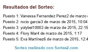 Lista de participantes: Vanessa Fernandez Perez2 de marzo de 2015, 22:07, yolybel10002 de marzo de 2015, 22:15, Ana Abeja Maya2 de marzo de 2015, 22:22, Vanesa Molina2 de marzo de 2015, 22:23, Nuria Macías García2 de marzo de 2015, 23:01, Vanessa Cuadrado Palomo scs1984_23 de marzo de 2015, 1:03, Sortea Ycolabora3 de marzo de 2015, 7:47, rocio garcia3 de marzo de 2015, 10:04, Vanessa Gumilla3 de marzo de 2015, 11:43, Natalia Ll.g3 de marzo de 2015, 12:16, Lolly3 de marzo de 2015, 14:52, Mary María3 de marzo de 2015, 15:17, Rebeca Lopez Jimenez3 de marzo de 2015, 18:06, Ana Isabel Sastre3 de marzo de 2015, 21:14, Milena3 de marzo de 2015, 22:52, Flory Mar4 de marzo de 2015, 1:17, ana navas bertol4 de marzo de 2015, 11:23, Nuri M.b4 de marzo de 2015, 11:23, Miva Fdez5 de marzo de 2015, 22:43, Eva Martínez6 de marzo de 2015, 12:41.