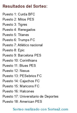 Lista de participantes: American PES, Atlético nacional, Barcelona PES, Blues PES, Corinthians, Curda BFC, Epic, Halcones, Maricons FC, Mitos PES, Nexus, PESebrios FC, Renegados, Tigres, Titanes, Trumps FC, Universitario de Deportes, Cajachos FC.
