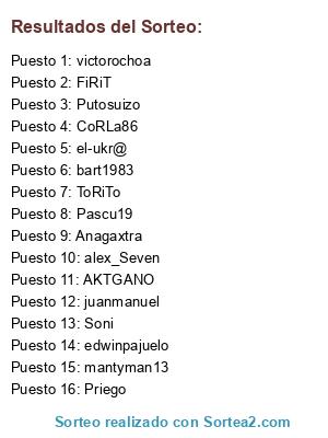Lista de participantes: ToRiTo, juanmanuel, CoRLa86, alex_Seven, bart1983, Pascu19, AKTGANO, Soni, victorochoa, Priego, mantyman13, Putosuizo, el-ukr@, edwinpajuelo, FiRiT, Anagaxtra.