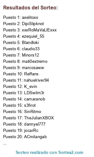 Lista de participantes: s3firot, imparato, kopersv100, Blandloki, mati0extremo, K_evin, nahuelriver94, arielkpos, xxxRoMaVaLlExxx, ezequiel_55, el_diego_akd, DipiSlipknot, Minors12, ACmilangab, jocarRc, Ivan240211, SinRitmo, claudio33, LDSwilm3r, PsrfYankee, camaranob, Reffans, axelitoxx, Omerto, RicardoGA, dannyel777, marcosaww, D4rCkAr, TheJulianXBOX, darkas_7, jotero15, claudiomuino.