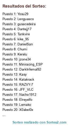 Lista de participantes: JFF_VLC, Dantejj17, X0abel0x, Yosu29, jzone34, kike_95, Kasy, Pedrinho10, Elreyelfo, gusacedeira, Lemako, Frankonil, Lenguasco, Huevon, RAZVY-7, DanielSan, Chumi, Katakrack, Asturcon3, Nacho1912, DarkInfernal92, Miniracing_ESP, Tankvire, Kerelu.
