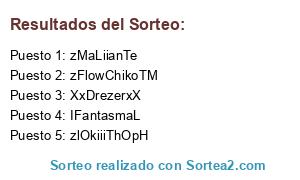 Lista de participantes: TheZeuZz, zMaLiianTe, Diego12210, XlSTarGamelX, DeLoMiO, lBvmbUchvHMz, WaltersitOXx, aikranba, Camuk, xHvengadorHx, zViPDiaBoLiC, kriko15, casdtk45, iiAmDonCanHz, antikristo, WAZAMASNA, CASCARITAXD9, xlxDANGERxlx, ELMEJORADO1, lokaman, TheJuJo007, zlSriitoDark, NyxmarioAL, WarrenD, XDShooterXD, IQmarPR, SKybom, AmadoBouDou, revenge159, lfairytaill, matapendejas, JaiiRXpL, Romanseee, DjFonTana3D, xXLION3005Xx, theMANcree, davidelpotr0, NxYGnrMack, guiroma240, Honz, ExcluzivoHD, C4z4DorPunkx, xx3chizenxx, ZzDarKFenizZ, djleo, zMcZn, xDSoftnyCahs, kasikex1, HzDarwinHz, RainbowDash, StarKun, xXkanvtoxX, lNiniiOwl, LAPSUS, lbluminista, zTerkOzmOke, AmaRok2013, IIDarkBlack, maku25, iTzpulpoOxP, zJlhOnPkMs, MaTachilenoS, DarKGiveR14, zlSlipknoTz, IHigCore, zlOkiiiThOpH, lSnkevinxX1, XxPiLoLoXx12, betoyriby12, BoyCrvziToHz, XDrackXpL, to5monster, jhoselin2, ThChiccotti, zViPZaTaNiCk, DIEDHARD, xsenseix, ThEiNfErNaLr, playboyyy, 666ricardo666, xAldolegenDx, zTDaRkEmOICI, lovomasterlo, xpaulinox, llcezitarhzll, yostina520, GTjhonhenry, AndyBreakDan, Cansadotoy, 3lackDRagon0, bellacango, SnkGokuSnk, soloemo16, itzLuiSxPz, JHONY138, lordeyvi, XxCenTxX, HvmillaTioHs, zDatzonHz, DarkWarkZ, OopectrosoO, IDaRkSerGiOo, zDarkPejeXpL, SoniEriksson, zTonThiToHs, victorbeiza6, elPENDEJO206, yukaniakotek, TzFelipeHz, zxangelzx, antonello, matadorxcx15, RAGGER, HzlllPK2lll, LadderFelix, zDjairFV, POLLOVEDEA, RTFUFGH, TargetDown, LikinParkll, zlRiiCh4rDz, BXGfxcdgFERYc, frrdeii, lBraynLaiOn, dolorprix, jxsmith, granblack, DarkreibeRXD, Epiral, lZerO1, NeoRiley, lucyanlukan, CheTTy10, ReyTalentoHz, marco0s, 4Hits, 3ldiosfenix, IxCR7xI, AyiTo7, dark1forever, LOPITA123XD, xxsanchezk, xzlokendoxz, cristprox, xx21gunz, zNarutOkyubi, dracu13, SkanGoZuLoVe, zPatukulOHs, XxDrezerxX, xIkendalLx, J2StinGray, rafael190, zCrazyOverMp, 09pablito09, GhostDelta, J2eyDanny, zXLmFa0Xz, dandenxxlp, peluzo3000, ITDrakerzT, IFantasmaL, LUNATICUS, zFreddyZhit0, lzPedrozl, zFlowChikoTM, gomitas55, zFumonZiiToz, JesvxitoDark, zCachitOHz, IIJUNIORIII, IBlackStarIl, zlCaizif3rHz, ZhamakitoxXD, zSeDWorks, XxregaexX, MrFreso, AQueMaRoPaLF, x0junior0x, ShejoPoli.