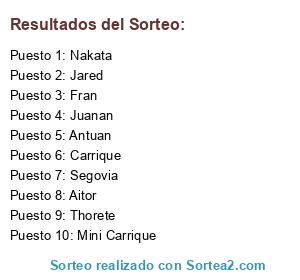 Lista de participantes: Nakata, Fran, Juanan, Carrique, Thorete, Antuan, Aitor, Jared, Segovia, Mini Carrique.