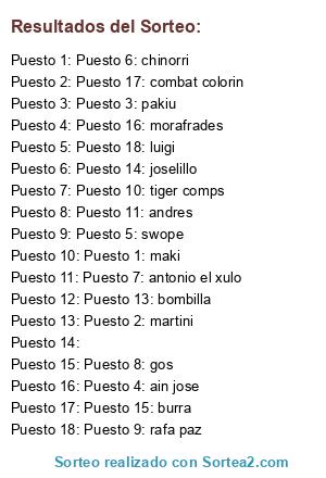 Lista de participantes: Puesto 1: maki , Puesto 10: tiger comps , Puesto 11: andres , Puesto 12: skidi kaiser , Puesto 13: bombilla , Puesto 14: joselillo , Puesto 15: burra , Puesto 16: morafrades , Puesto 17: combat colorin , Puesto 18: luigi , Puesto 2: martini , Puesto 3: pakiu , Puesto 4: ain jose , Puesto 5: swope , Puesto 6: chinorri , Puesto 7: antonio el xulo , Puesto 8: gos , Puesto 9: rafa paz , .